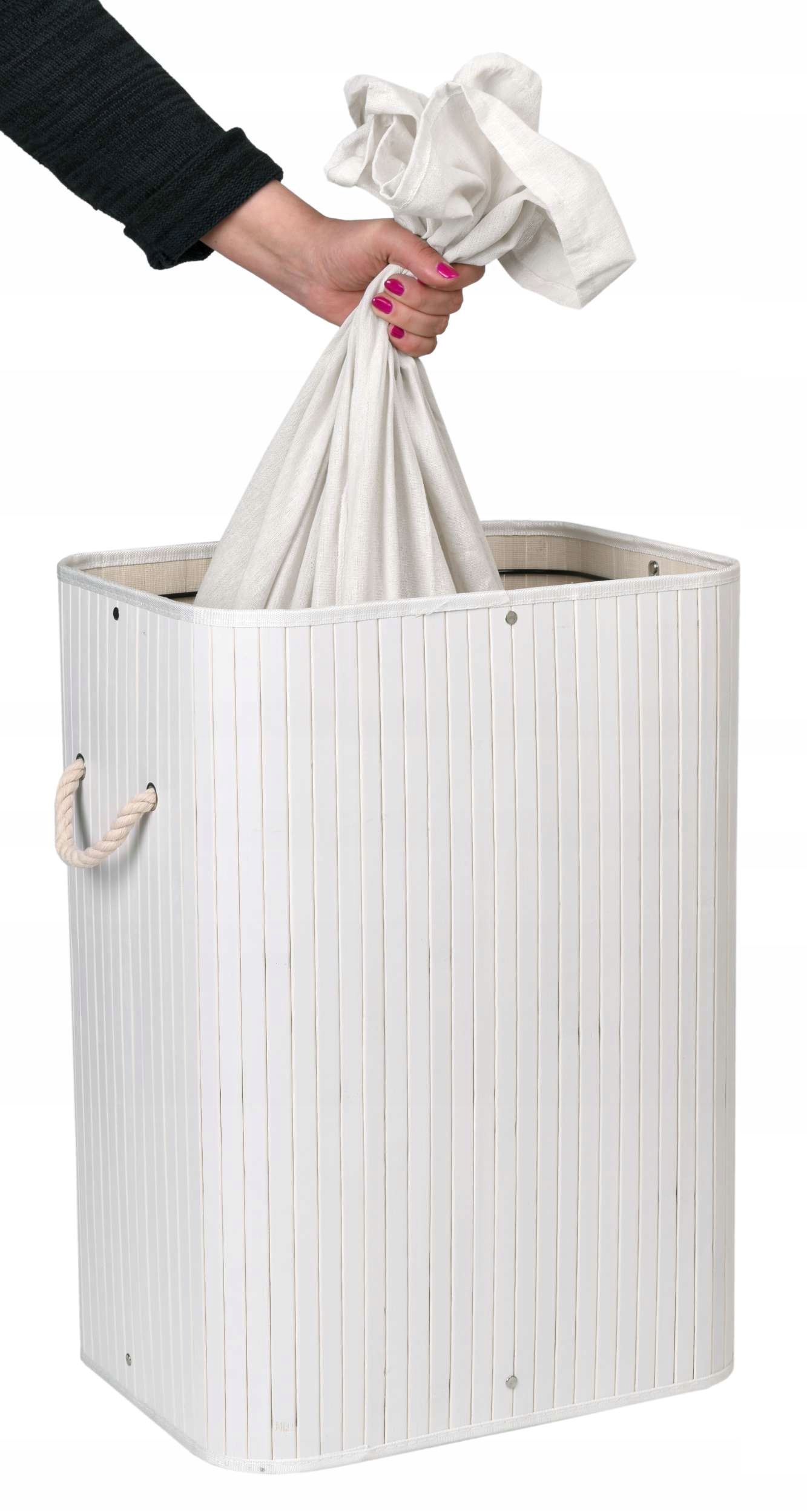 Контейнер закривається кришкою з ручкою з товстої мотузки, завдяки чому вміст кошика не є ошатним видовищем, не кажучи вже про неприємні запахи брудного одягу. Сам контейнер має дві мотузкові ручки з боків, які полегшують перенесення.