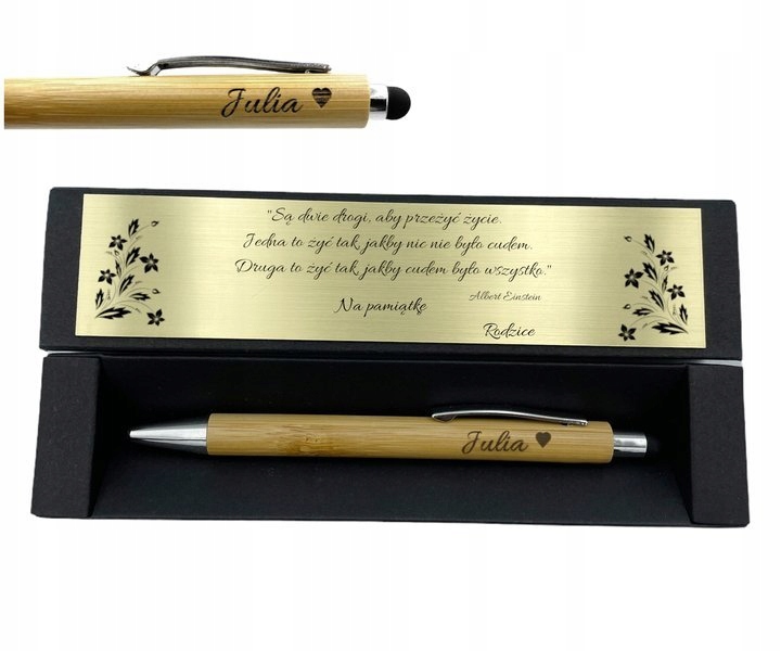 Бамбукова ручка зі стилусом і блискучим хромованим покриттям. Бамбук є натуральним продуктом, можливі невеликі відмінності в кольорі та розмірі. Синій картридж. Канцтовари в картонній коробці. Ми можемо зробити будь-яке гравіювання на виробі. До ручки йде коробка, на яку ми розмістимо табличку з вашою присвятою.