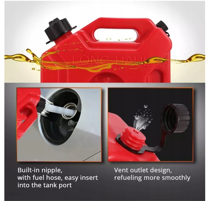 Каністер виготовлений з надзвичайно сильного матеріалу. Гвинтова пробка оснащена безпечною гумовою прокладкою, прикріпленою до знімної воронки. Гарантована жорсткість дозволяє транспортувати його без ризику випадкового забруднення та колючки. Він має вентиляційну пробку на протилежній стороні воронки - при заливці палива це зменшує явище попереду та бризок.