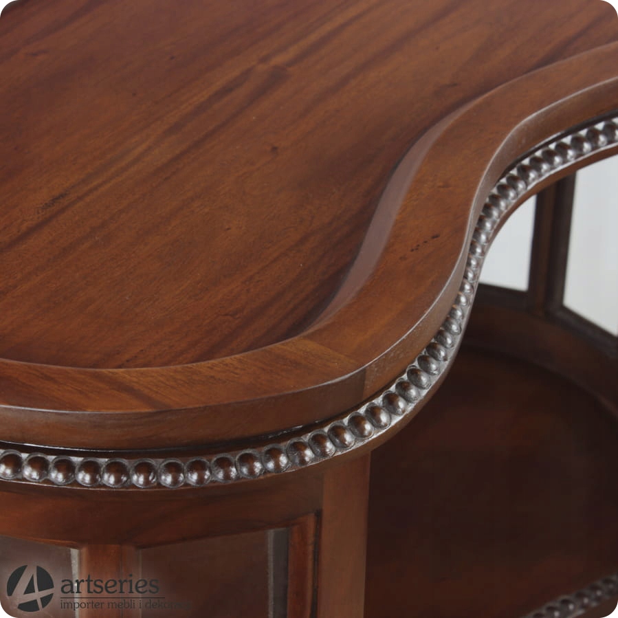 Ви любите лікери? У вас є красиві графини, і ви шукаєте бар, який дозволить вам виставити їх? Тоді ви не могли б зробити кращий вибір! Будемо раді познайомити Вас з нашою пропозицією! Представляємо батончик, корпус якого має форму квасолі. Має дверцята, розташовані в увігнутій частині. З боків розташовані вертикальні вітрини по всій довжині, завдяки чому розміщені всередині предмети виглядатимуть чудово. Штанга розміщена на чотирьох тонких вигнутих ніжках. Крім того, він оснащений дерев'яним підносом, який також є найвищою частиною меблів. Барна стійка виготовлена вручну з масиву червоного дерева. Наданий їй теплий горіховий колір чудово підкреслює тонке декоративне різьблення, а головне – чудово контрастуватиме з прозорим склом графинів чи інших пляшок.