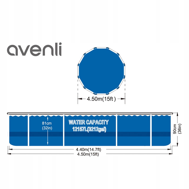 AVENLI PALM garden frames pool - ідеальне рішення для тих, хто хоче насолоджуватися розкішшю та комфортом у свій власний сад. Цей круглий басейн із вражаючим діаметром 450 см і висотою 90 см поєднує в собі елегантність, довговічність і функціональність, відповідаючи очікуванням навіть найвибагливіших користувачів. Завдяки міцній конструкції та високоякісним матеріалам, басейн PALM забезпечує не тільки чудове задоволення, але також безпеку та комфорт під час використання. Оснащений ефективним фільтруючим насосом продуктивністю 2006 л/год, він гарантує кристально чисту воду протягом усього сезону. Блакитний колір басейну додає свіжості та ідеально вписується в будь-який сад, створюючи ідеальне місце для відпочинку та веселощів. Додайте своєму саду унікальний характер і насолоджуйтеся незабутніми моментами з родиною та друзями завдяки басейну AVENLI PALM.