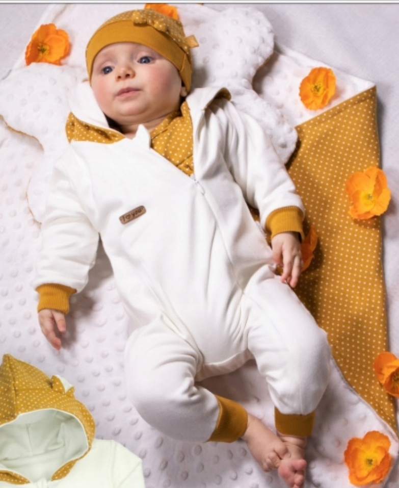 Крій: Комбінезон з капюшоном з додатковою підкладкою з бавовни. Застібається по діагоналі на блискавку. Штанини та рукава оброблені манжетами. Декоративна шкіряна нашивка спереду.