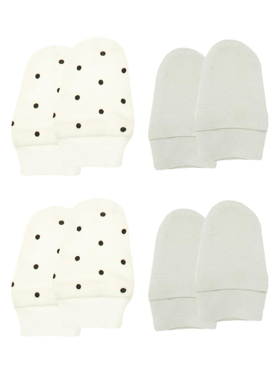 Рукавички, 4 упаковки подушечок зі 100% бавовни, сертифіковані Oeko-Tex Standard 100. Надійний текстиль. Вони випускаються в двох кольорових версіях. Перший кремового кольору з чорними крапками, другий оливкового кольору. Моделі мають шнурок без тиску. Рукавички захищають новонародженого від подряпин.