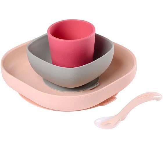 Блюдо має протиковзку присоску на дні, що робить його стійким і добре тримає стіл. Набір рожевих відтінків, лише чаша сіра.