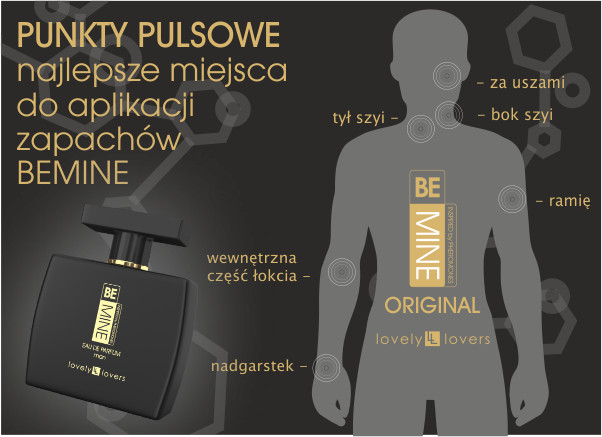 Оригінальний чоловічий ароматний букет був створений у Франції завдяки досвіду бренду LOVELY LOVERS. В результаті досліджень і випробувань 237 ароматичних атрактантів у різних пропорціях. Було відібрано ті, які справляють найбільший вплив на протилежну стать, виявляючи максимальну спокусливість комплексу ароматичних масел. Так була створена основа формули I-L-Molecules (INTENSE LOVE MOLECULES). Він був удосконалений таким чином, що він синергетично поєднується з ароматом чоловічої шкіри, створюючи унікальне ціле. Найвища концентрація та якість інгредієнтів, використаних для створення деревно-трав’яно-квіткової композиції BEMINE Original, дозволяє створити спокусливу ауру, повну чоловічих вібрацій, елегантності та свіжості.