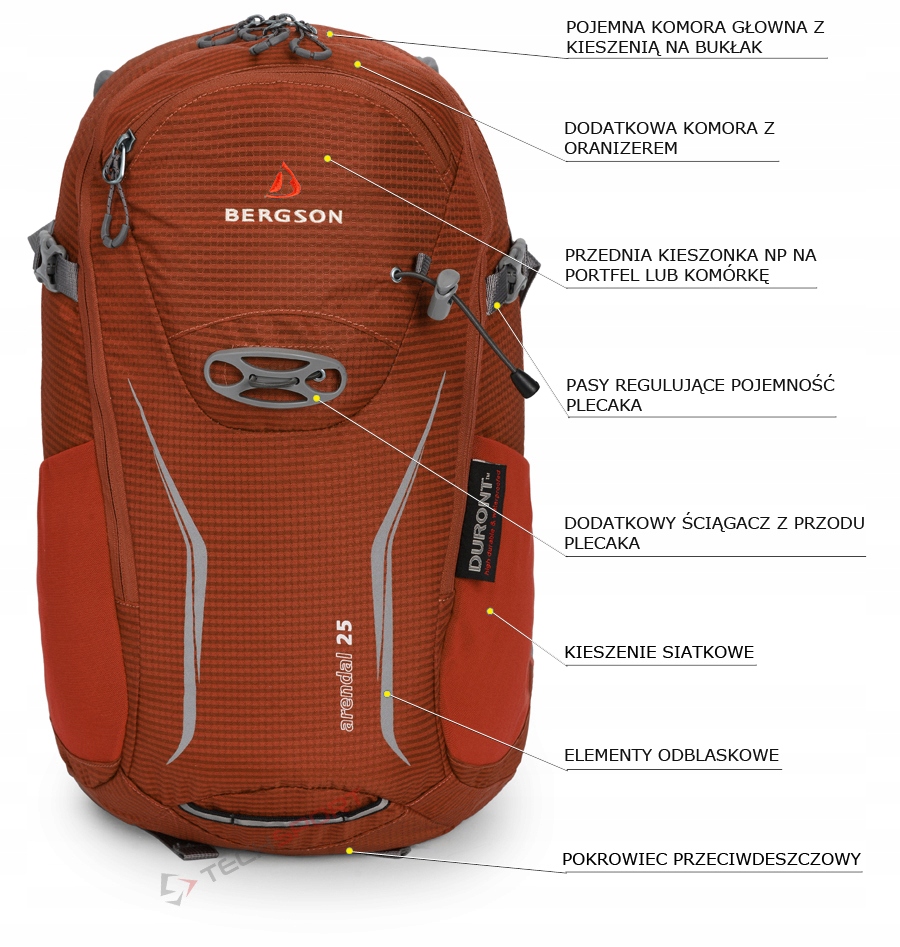 зручний рюкзак Бергсона з інноваційною системою підтримки. Арендальна модель буде працювати як під час поїздок до гір, так і як міський рюкзак чи шкільний рюкзак. Він має зручний тазостегновий пояс і грудний пояс стабілізує рюкзак на плечах рятувальним свистом, вбудованим у пряжку. Завдяки додатковій кишені всередині рюкзака та спеціальній дірі, вона була пристосована для монтажу зумер (пропозиція відповідного букетів міститься на інших наших аукціонах). Рюкзак також має можливість прикріплювати Києв або Кзекан. Завдяки системі завантаження Air In-Vent SQ-Mesh® з анатомічно формою "S" у формі "S", рюкзак дуже добре зношений, він зручний і навіть після довгої подорожі ми не будемо втомлюватися. Дуже міцно зроблений і добре закінчений - удосконалював кожну деталь. Виготовлені з найвищих матеріалів: сотня RIP -stop Duront® - дуже довговічна, і в той же час легка тканина з стволою конструкцією, додатково зміцнена додаванням додаткового, сильнішого волокна. Завдяки використанню сітки повітряної сітки на брекетах та на подушках системи підтримки рюкзак дозволяє безкоштовно циркуляцію повітря. Рюкзак характеризується високою стабільністю і забезпечує комфортну роботу навіть у важких умовах при великих навантаженнях.
