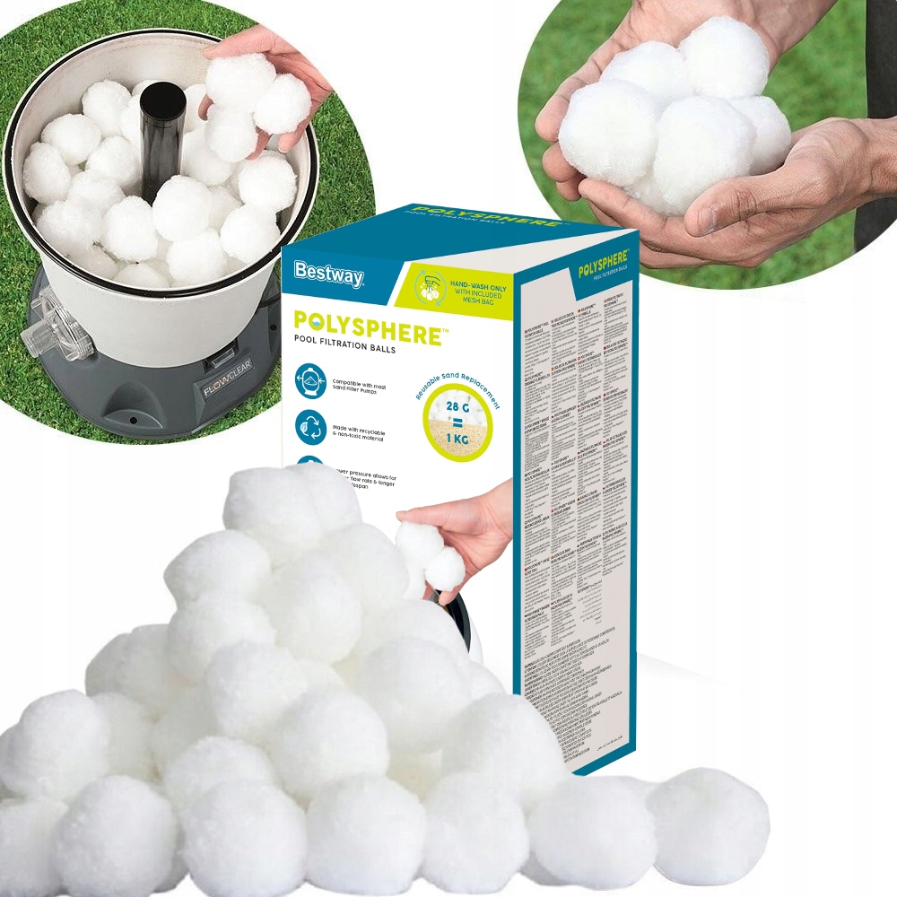 Кульки-фільтри — чудова альтернатива звичайному піску. Вони чудово працюватимуть у всіх піщаних фільтрах. Крім того, вони багаторазові. Просто виперіть їх у пральній машині або вручну. В упаковці 500 г фільтруючого аксесуара, який замінить цілих 18 кг піску. Крім того, мала вага забезпечує менший тиск і, як наслідок, більшу ефективність фільтруючого насоса.