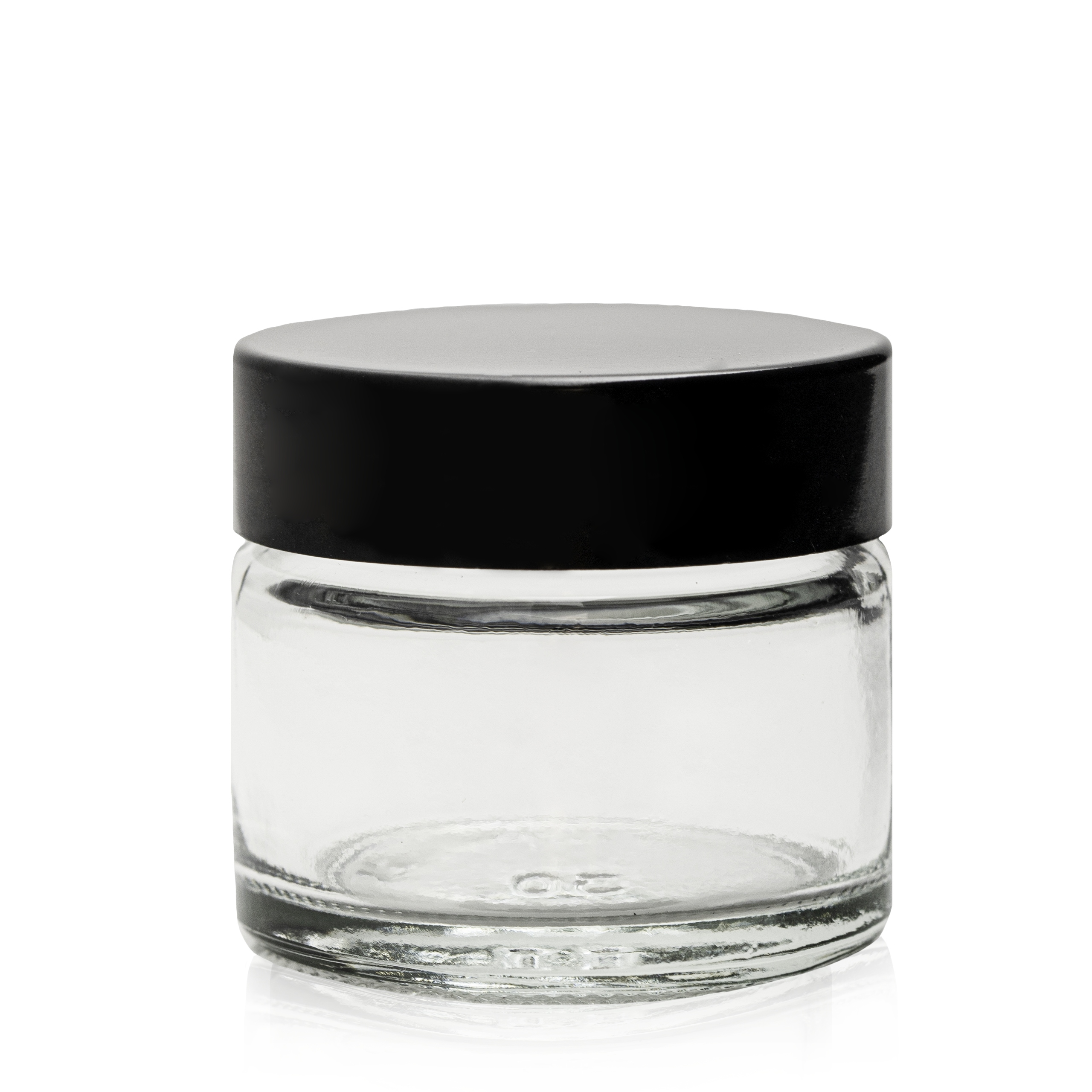 Скляна банка ємністю 30 мл з прозорого скла. Банка поставляється з чорною пластиковою кришкою та захисною вставкою.
