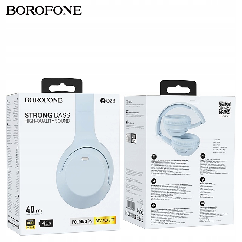 BOROFONE BO26 Delightful — бездротові портативні/мобільні/накладні/навушники з Bluetooth 5.3 технологія з 3,5-мм роз’ємом AUX Jack і слотом для карт пам’яті microSD / Trans Flash, оснащений мікрофоном, що дозволяє здійснювати телефонні дзвінки, і кнопками для керування музикою або дзвінками.