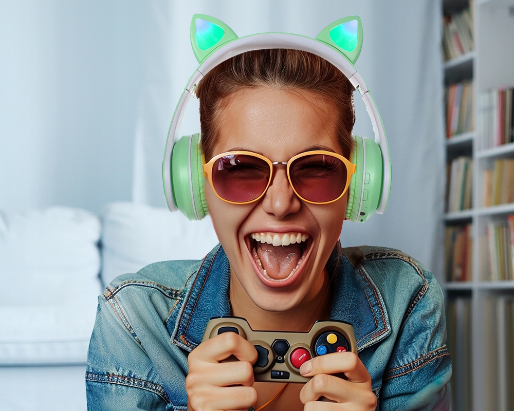 🐱 Навушники справляють ще більше враження, коли темно. Вони світять у різних режимах і кольорах. Вони демонструють кольори від синіх відтінків, через червоний, зелений, жовтий до рожево-фіолетового. Кольори плавно проходять у наступний у різних порядку, швидкості, світить разом і окремо. Швидкість також виділена!