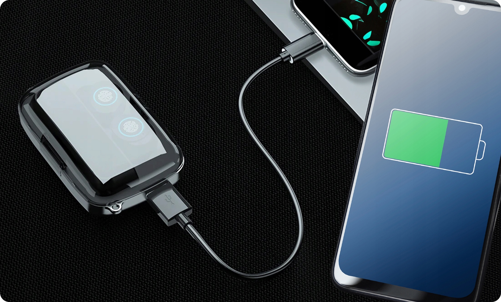 ✅ Блок Powerbank дозволяє заряджати два навушники одночасно або окремо. Заряджайте навушники за допомогою Powerbank і підключіть їх до телефону. Після сполучення навушники автоматично запам’ятовуються, і наступного разу вони самостійно підключаться до телефону відразу після того, як їх вийняти з футляра!
