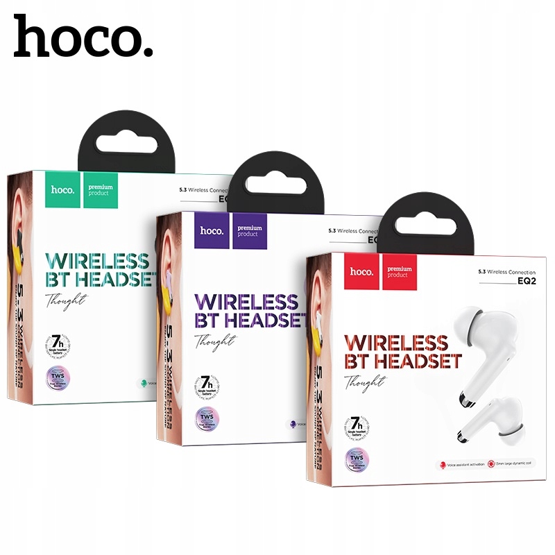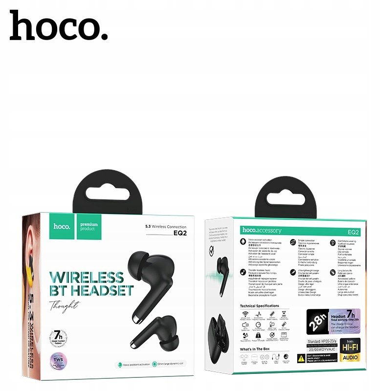 hoco. EQ2 Thoughtце бездротові бездротові навушники-вкладиші з технологією Bluetooth 5.3 TWS, оснащені футляром, який служить зарядним пристроєм з акумулятором ємністю 320 мАг. Самі навушники мають акумулятор ємністю по 40mAh. Навушники мають мікрофон, який дозволяє здійснювати телефонні дзвінки та сенсорні кнопки для керування музикою або телефонними дзвінками та розмовами. Вони мають внутрішні динаміки діаметром 13 мм, які дають дуже гарний, чистий звук за таку ціну та цінність.