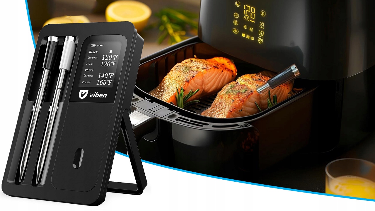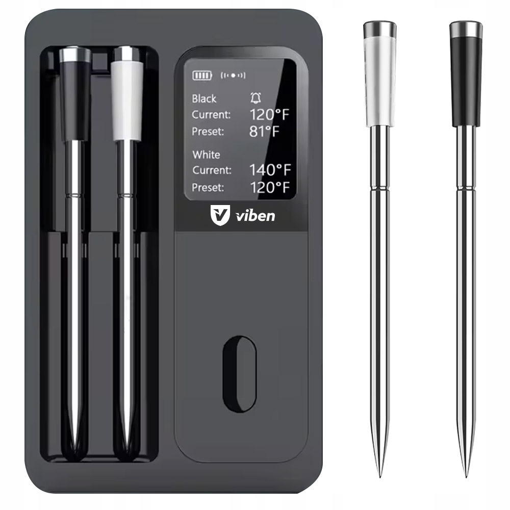 Точне приготування їжі у ваших кінчиках! термометр для бездротового м'яса Viben - незамінний інструмент для кожного вентилятора на грилі та приготування їжі. Оснащений двома вдосконаленими зондами , забезпечує точне вимірювання температури, що дозволяє приготувати ідеальні стейки, смажені та інші страви. Завдяки бездротового з'єднання Ви можете контролювати температуру м'яса навіть з відстані 60 м, а мобільний додаток полегшує моніторинг процесу приготування. водостійкість IP67 гарантує довговічність та безпеку використання.