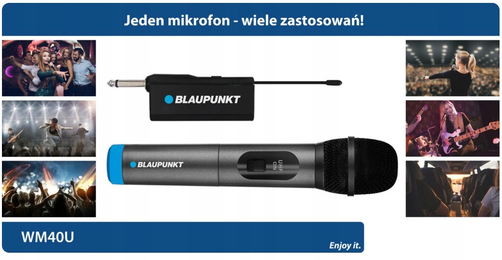 Мікрофон WM40U — ідеальне рішення для широкого спектру застосувань. Ідеально підходить для використання на сцені, під час конференцій, у студії звукозапису або вдома. Він сумісний з динаміками серії BLAUPUNKT PA та MB, а також з іншими пристроями, доступними на ринку.