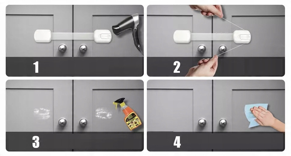 Легка в установці шафка для шаф – ідеальний спосіб захистити пальці вашої дитини від защемлення. Замок підходить для кріплення всіх типів дверей, ящиків або сидінь унітазів ;). Для цього використовується міцний і довговічний двосторонній скотч від відомого бренду 3М. Просто очистіть поверхню шафи/шухляди та знежирте її, а потім нанесіть захист шафи. Приклеюємо замок так, щоб одна його частина була на дверцятах, а інша на стінці шафи/шухляди. Міцна стрічка гарантує, що замок шафи не відірветься при потягуванні та ідеально виконає свою роль.