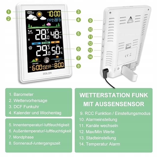 Просте управління: обладнана радіогодинником, бездротова метеостанція автоматично оновлює час і дату ввімкнення без необхідності ручного налаштування. Чіткий кольоровий дисплей: кольоровий дисплей із великими цифрами забезпечує дуже інтуїтивну видимість, навіть з відстані кількох метрів, дані вимірювань можна чітко читати. Точні дані вимірювань: метеостанція автоматично шукає сигнал бездротових зовнішніх датчиків і швидко відображає точні дані про температуру та вологість у приміщенні та на вулиці. Його можна розширити до трьох зовнішніх датчиків. Регульована яскравість: головна станція метеостанції живиться від кабелю живлення і може горіти безперервно. Яскравість можна регулювати на 4 рівнях відповідно до різних потреб протягом дня та праворуч. Два варіанти розміщення: основну станцію та датчики можна повісити на стіну або розмістити на столі, що забезпечує гнучке розташування.