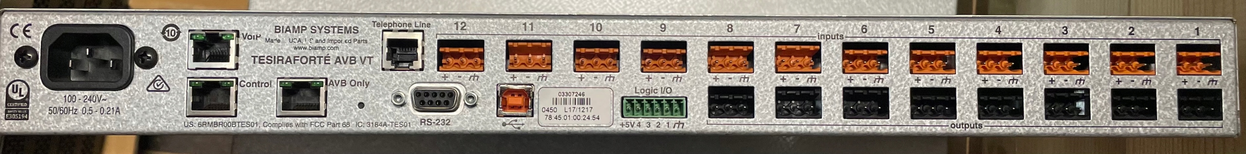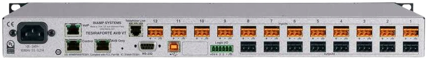 Tesiraforté AVB VT - це цифровий аудіо -сервер з 12 аналоговими входами та 8 аналогами. Усі входи оснащені технологією акустичного ехо (AEC - усунення акустичного ехо). Ця модель також має максимум 8 настроюваних аудіоканалів USB, 2-канальний інтерфейс VoIP та стандартний телефонний інтерфейс FXO (аналогова телефонія). Tesiraforté AVB VT використовує мережеве рішення цифрового аудіо AVB/TSN, і цей пристрій може використовуватися як незалежний або в поєднанні з іншими пристроями та серверами Tesiraforté AVB, розширювачами, кінцевими точками та контролерами Tesira.