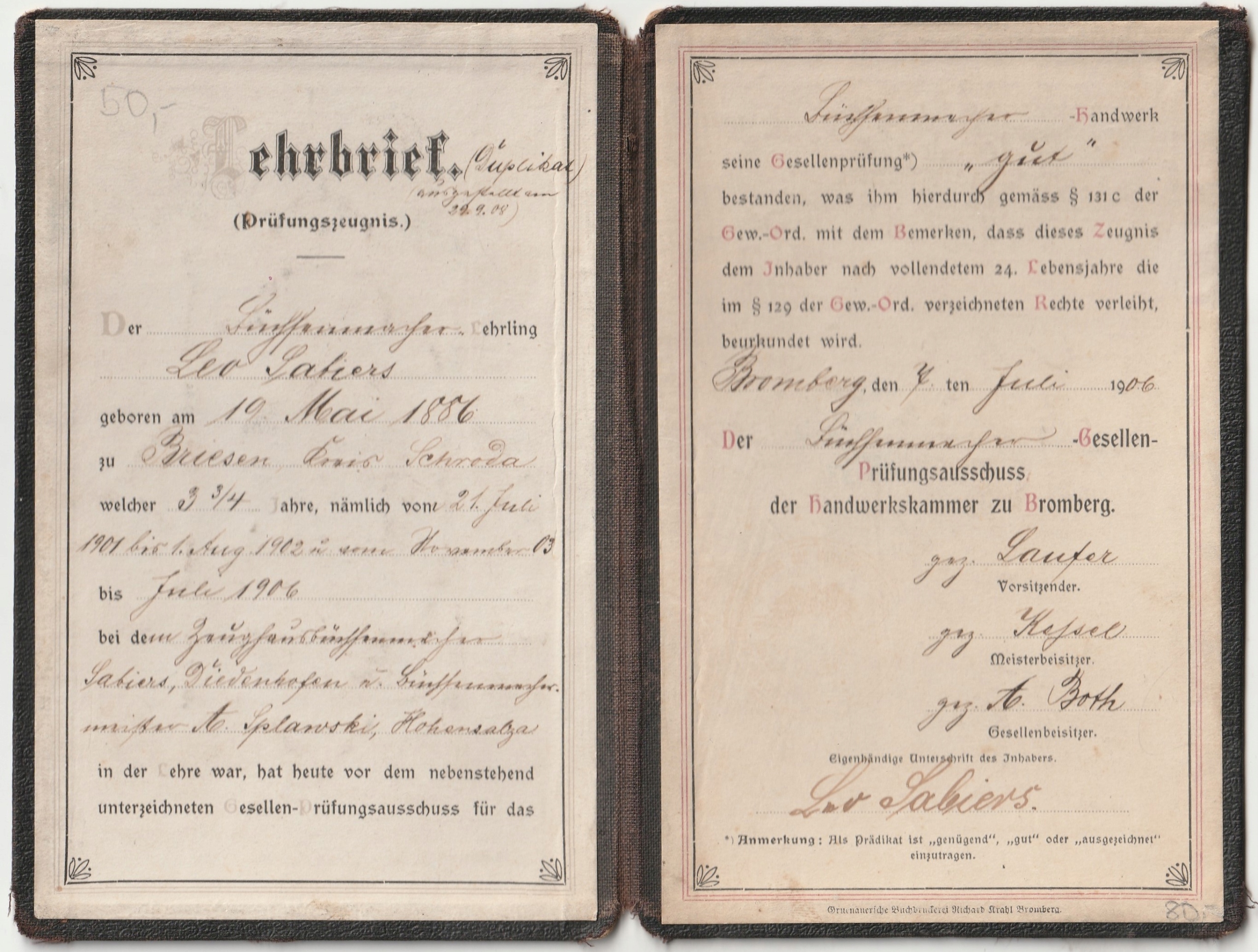 БИДГОЩ, СЬРОДА ВЕЛЬКОПОЛЬСЬКА. Свідоцтво підмайстра 07.07.1906 р., видане Ремісничою палатою в Бидгощі, для Лео Сальєрса, народженого в Сьродському повіті; тверда обкладинка, з тисненим написом та квітковими мотивами, незначні пошкодження корінця зверху та знизу, незначні забруднення; розміри: прибл. 110х170 мм; Lehrbrief (Prüfungszeugnis).