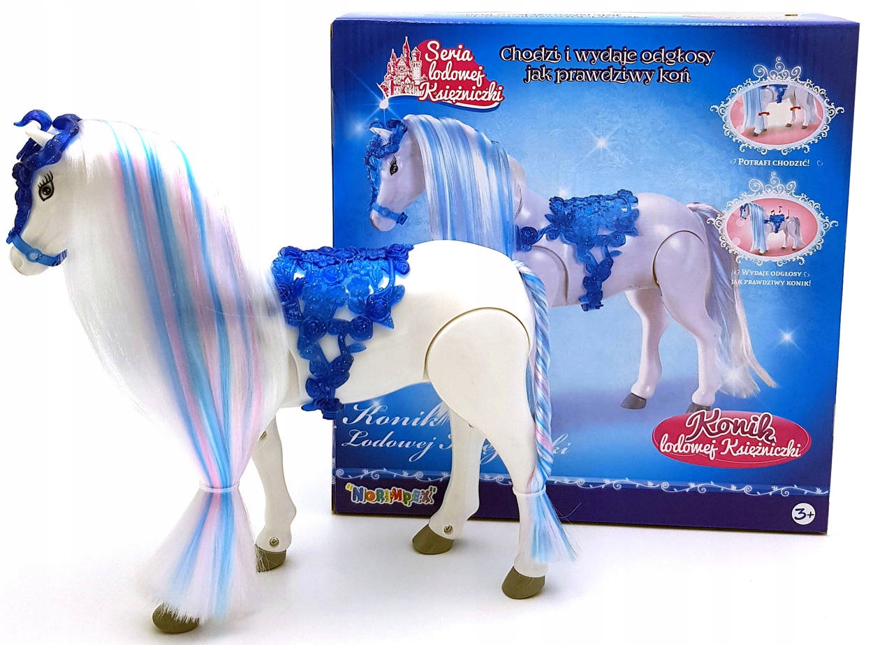 Кінь має гарну гриву та хвіст, а на спині має пишно прикрашене синє сідло. Крім того, кінь інтерактивний, тобто він ходить самостійно та видає звуки.