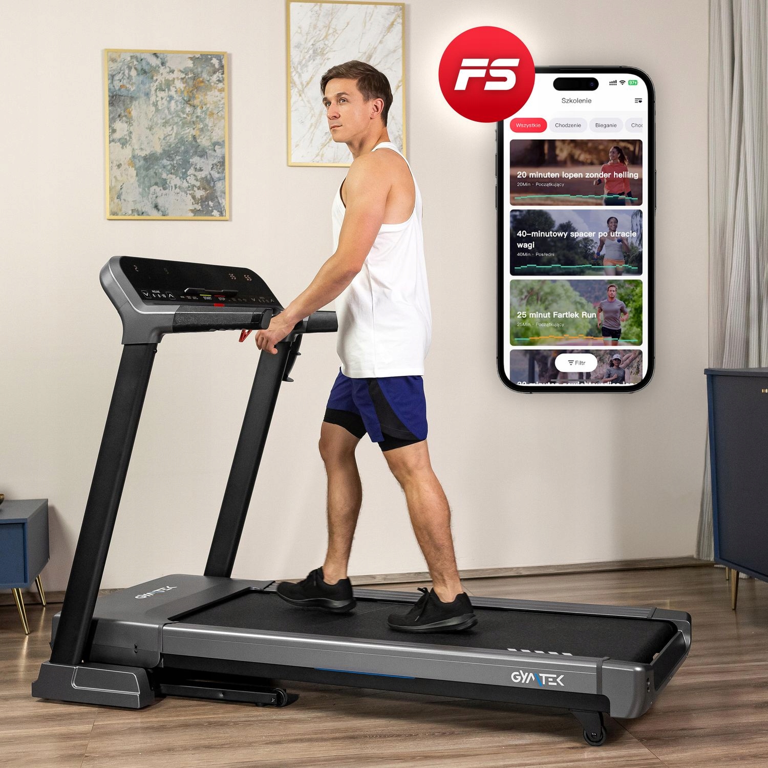 Відстеження прогресу дозволяє контролювати вашу відстань, швидкість, витрачені калорії та інші параметри в реальному часі, с запис історії навчання. Режим імітації маршруту дозволяє вибирати віртуальні місця з динамічним регулюванням нахилу бігової доріжки, що підвищує реалістичність та інтенсивність вправ. Додаток також дозволяє зв’язуватися з іншими користувачами, організовувати виклики та використовувати готові плани тренувань.