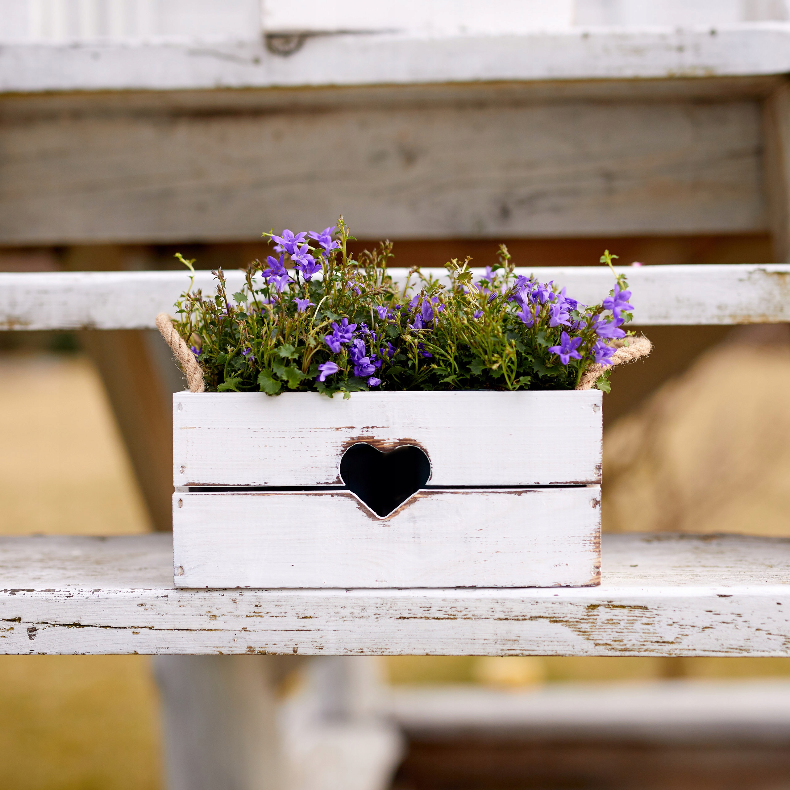 Ящик виготовлений з натуральної висушеної деревини спеціально відібраних хвойних порід дерев. Крім того, він пофарбований у білий колір із сільськими потертостями. Білий колір фантастично підкреслить зелень листя та фарби квітів. Шкатулка зі смаком вирізана у формі сердечка.