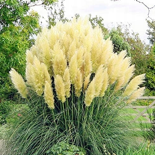 ОПИС: Біла слива пампасна трава — унікальна декоративна трава, що нагадує фонтан високого листя, яка влітку та восени радує своєю ефектністю. , пір’ясті суцвіття, що з’являються над листям на жорстких пагонах, складаються з величезної кількості дрібних білих колосків. Виростає максимум до 2 метрів у висоту. Сорт характеризується сильним ростом і рясним цвітінням.