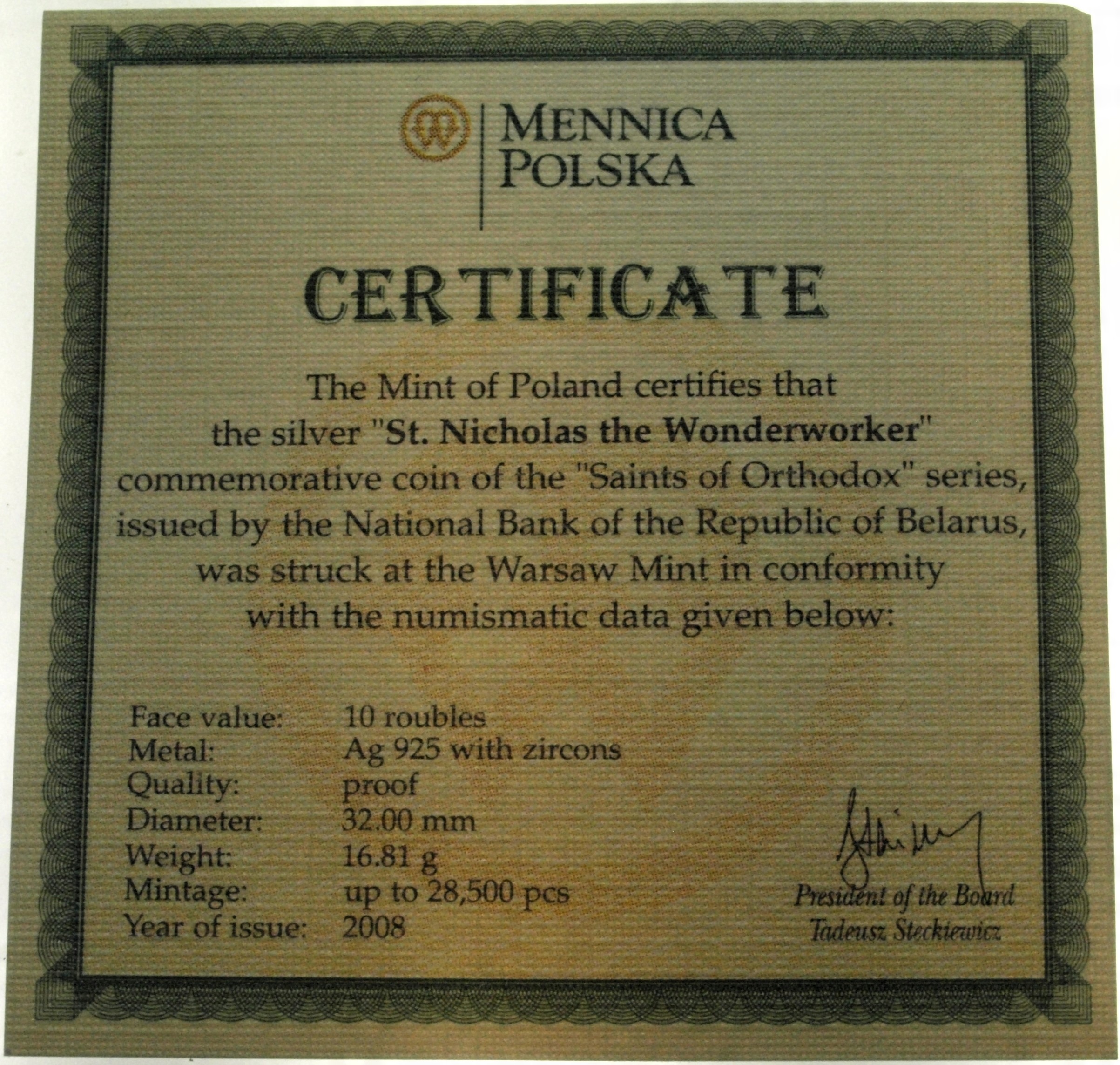 Білорусь 10 рублів 2008 Святитель Миколай Чудотворець СРІБЛО