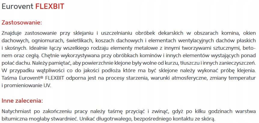 Бітумна стрічка Eurovent® FLEXBIT, ремонтна алюмінієва стрічка на бітумній основі, використовується для приклеювання та герметизації покрівельних елементів на плоских та скатних дахах. Доступний у кількох кольорових версіях. Виготовлений з бітуму, стрічки без розчинників з алюмінієвим шаром і силіконового розділового паперу.