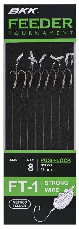 BKK FT-1 Feeder - серія поводків з гачками такої довжини, яка забезпечує миттєве зачіплення і максимальну міцність при ловлі великої риби фідером. Гачки з колючками, оснащені характерною для BKK обробкою SS, ретельно прив’язані до високоякісної волосіні.