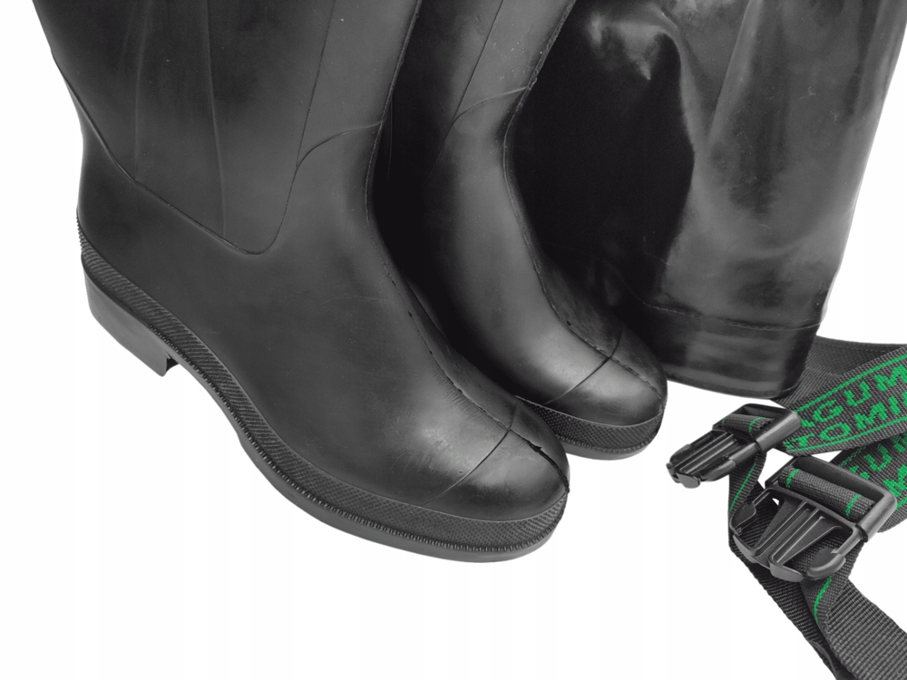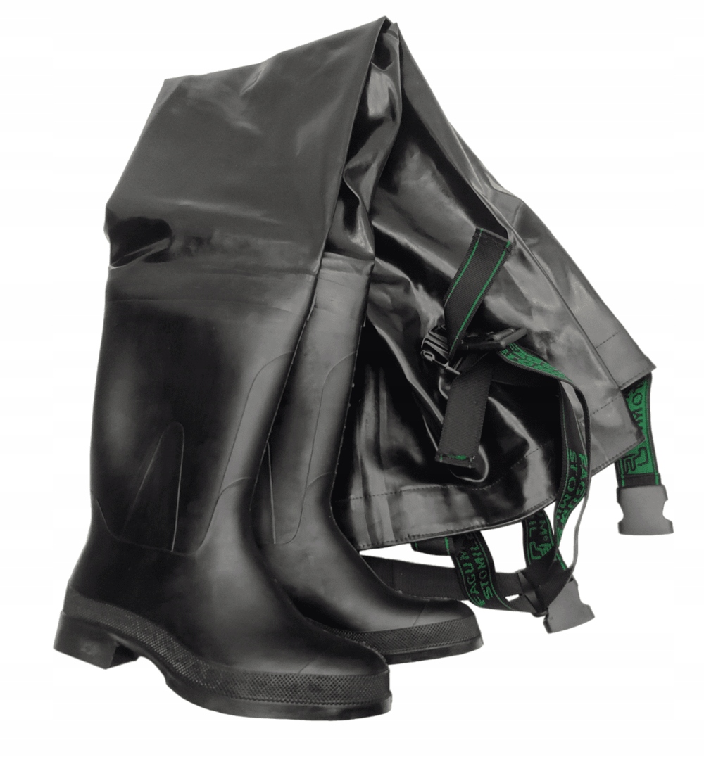 КОСТЮМ WADERS 2009/ FAGUM STOMIL. Міцні ботфорти з незмінно привареними башмаками та практичними підтяжками. Пропозиція для вимогливих клієнтів. Якісні вейдерси, які ідеально підходять для несприятливих погодних умов. Колір: чорний. Розмір: 39 - 47. Вага: приблизно 3,4 кг. Система складання: вулканізація в формах, ручна збірка. Верх і низ: гума. Підкладка: бавовна. Конструкція: модель, що поєднує в собі функції штанів і взуття, якісні зручні чоботи Wellington з незмінною приваркою, гнучкі підтяжки для кращої підтримки на тілі, роздільник на спині, що запобігає сповзанню підтяжок, внутрішня кишеня для дрібниць, стійка нековзна підошва, захист: сталевий підносок і вставка проти проколів. Комфортні і водонепроникні, вільно пересуваються, вейдерси незамінні для рибалок, що ловлять рибу на річках, використовуються для риболовлі та важких рибальських робіт. Вони надають найбільші можливості в зоні лову. Необхідне обладнання для кожного рибалки, який хоче ефективно ловити рибу на спінінг або нахлистом. Застосування: риболовля, риболовля, сільське господарство, лісове господарство, також корисно для прання та чищення.