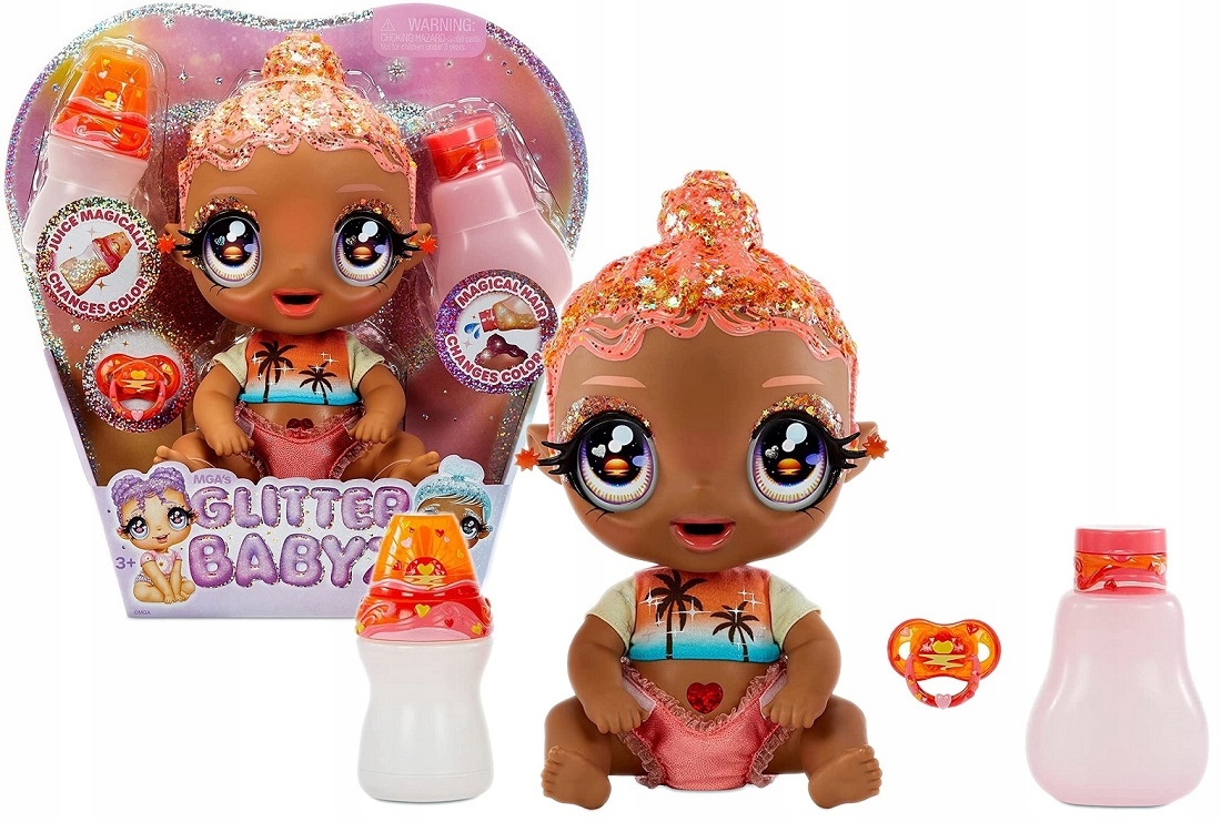 Колекція блискучих ляльок Glitter Babyz неодмінно сподобається дівчатам, які люблять піклуватися про малюків. Лялька Solana Sunburst любить сонце та все, що з ним пов’язано, а на футболці та аксесуарах зображено пальму.