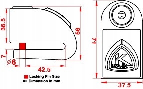 Замок гальмівного диска з вбудованим 120 дБ сигналізація з регульованими опціями ON/OFF сирени. Замок з нержавіючої сталі та водонепроникні електричні компоненти гарантують захист від корозії та надійність за будь-яких погодних умов. Замок оснащений довговічною та екологічно чистою літієвою батареєю. Захист блокує колесо штифтом діаметром 6 мм, що перешкоджає їзді та переміщенню мотоцикла чи скутера.