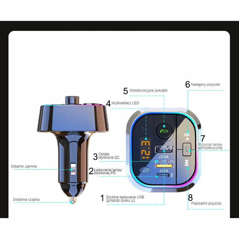 BLUETOOTH АУДІОПЕРЕДАВАЧ FM MP3 BT ШВИДКИЙ ЗАРЯДНИЙ ПРИСТРІЙ 3X USB QC 3.0 RGB