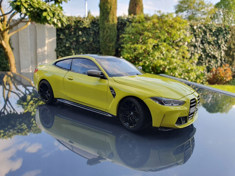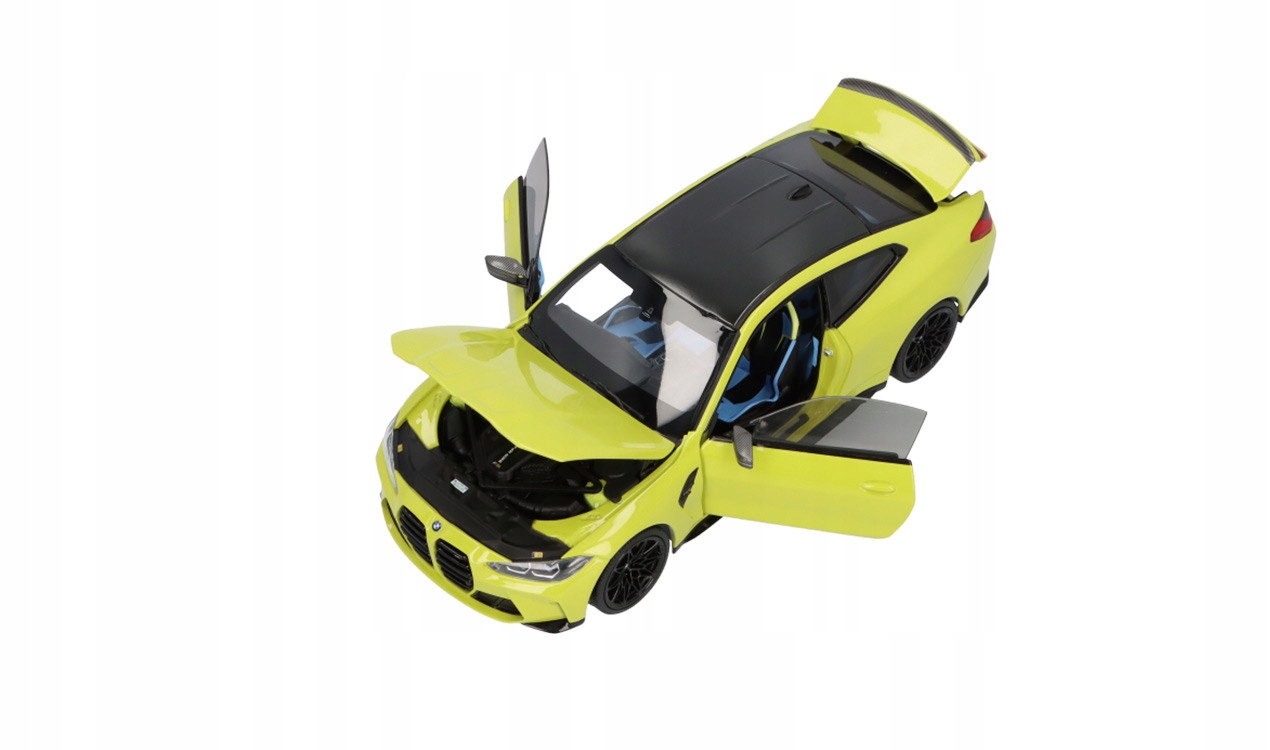 Модель BMW M4 кольору Yellow Sao Paulo M і інтер’єром Yas Marina Blue/Black підкреслює відданість до проекту BMW M4. Можливість відкрити кришку двигуна під репродукцією двигуна S58! Мініатюра представлена на базі з назвою моделі BMW M4.
