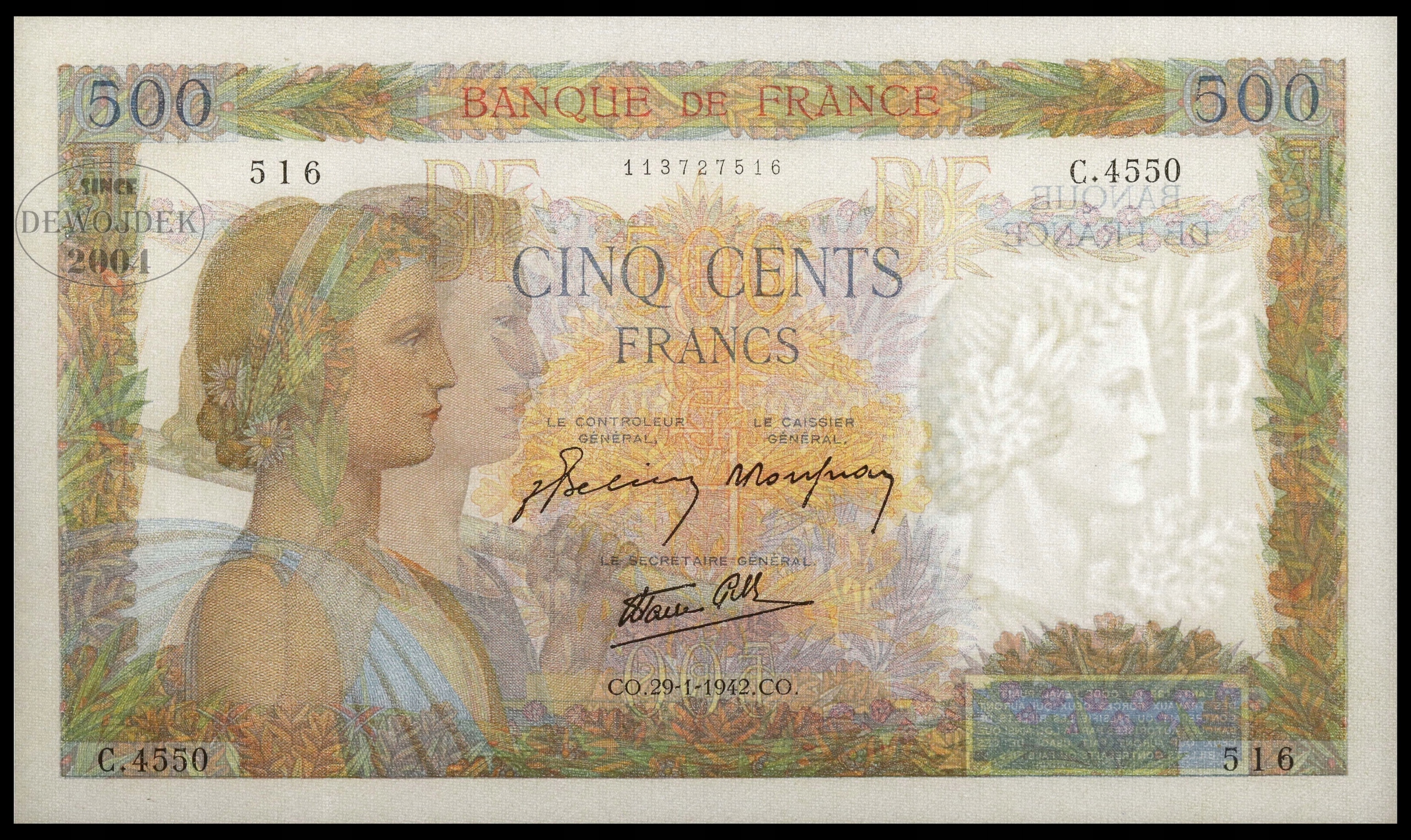 BNA - ФРАНЦІЯ 500 франків 1942 C.4550 516 # P95b # КРАСИВИЙ # UNC-