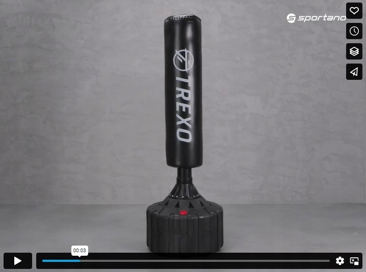 Окремо стояча боксерська груша Trexo для наповнення водою або піском виготовлена з міцного поліуретану та наповнена високоеластичною піною на внутрішній стороні . Після наповнення мішка потрібним матеріалом він дуже стійкий, завдяки чому ви можете успішно виконувати сильні удари руками або ногами, не боячись, що спорядження посунеться.