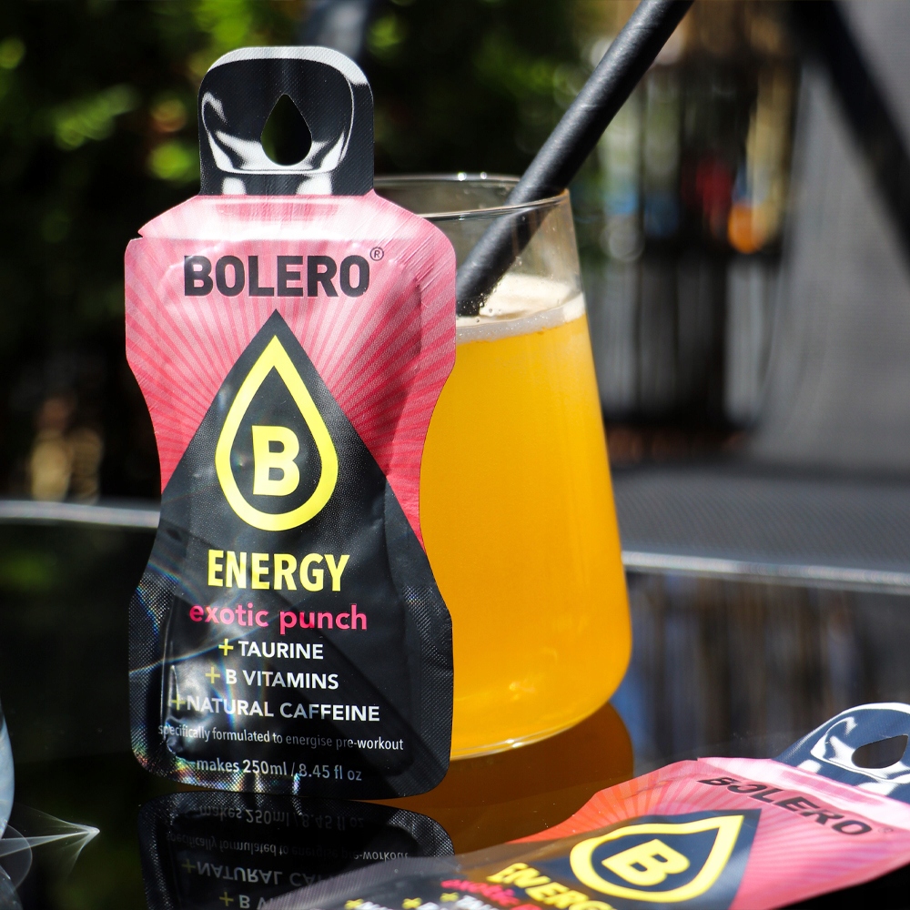 Bolero Energy Exotic Punch — це продукт, який поєднує в собі смак екзотичних фруктів і заряджаючі властивості, ідеальний для людей, які шукають додаткового заряду енергії протягом дня. Цей порошок для приготування напою пропонує не тільки освіжити, але й підтримати ваш організм завдяки ретельно підібраним активним інгредієнтам. Містить 1 г таурину, вітаміни групи В і 80 мг натурального кофеїну. Bolero Energy Exotic Punch — чудове рішення для всіх, хто цінує здоровий спосіб життя, адже він не містить цукру, підсолоджений стевією, консервантів та штучних барвників.