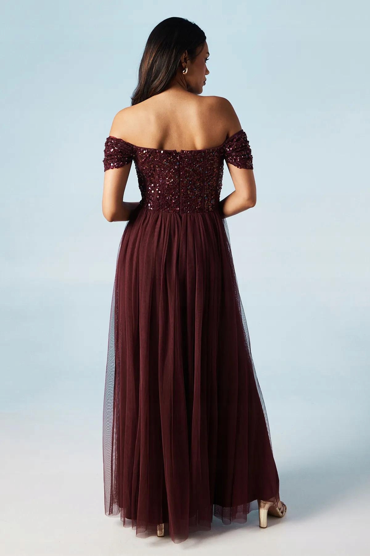 Бордова СУКНЯ МАКСІ, СПАДАЮЧІ ПЛЕЧА, ДЕКОРАЦІЇ З ПАЙЄТОК 36
