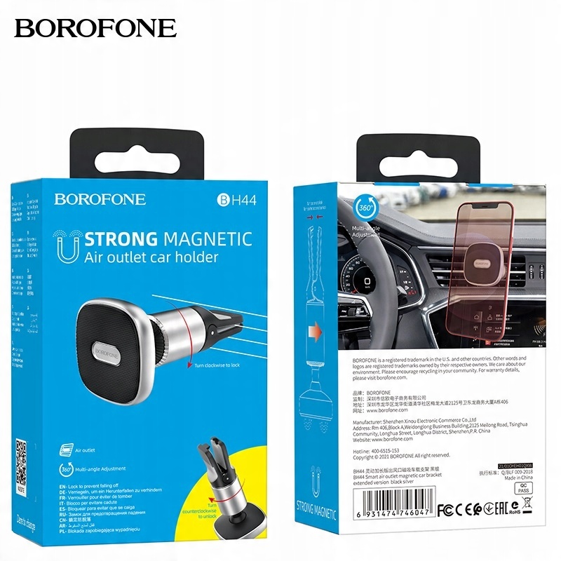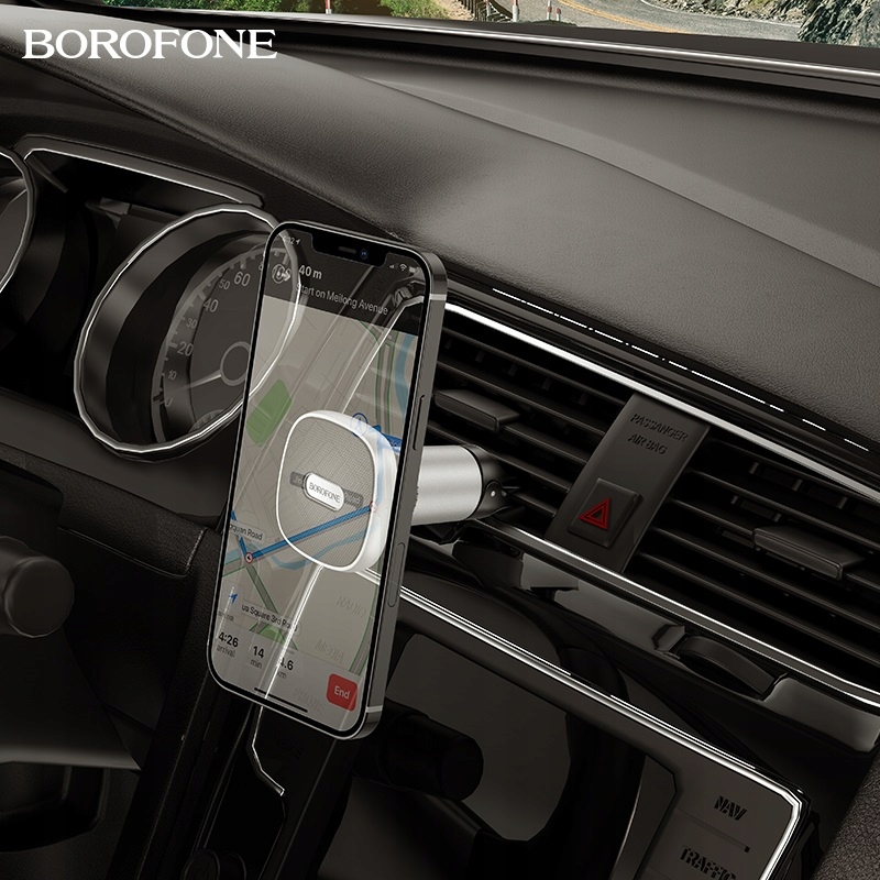 BOROFONE BH44 Smart – міцний і стабільний магнітний тримач, який підвищує безпеку водіння для вашого телефону, оснащений великим магнітом, регульованим на 360 градусів, прикріпленим до вентиляційної решітки автомобіля за допомогою силіконового затискача та додатковим різьбовим затискачем, розміщеним у решітці автомобіля, який утримує тримач у правій частині позиціонувати якомога сильніше та блокувати можливість випадання тримача з місця встановлення.