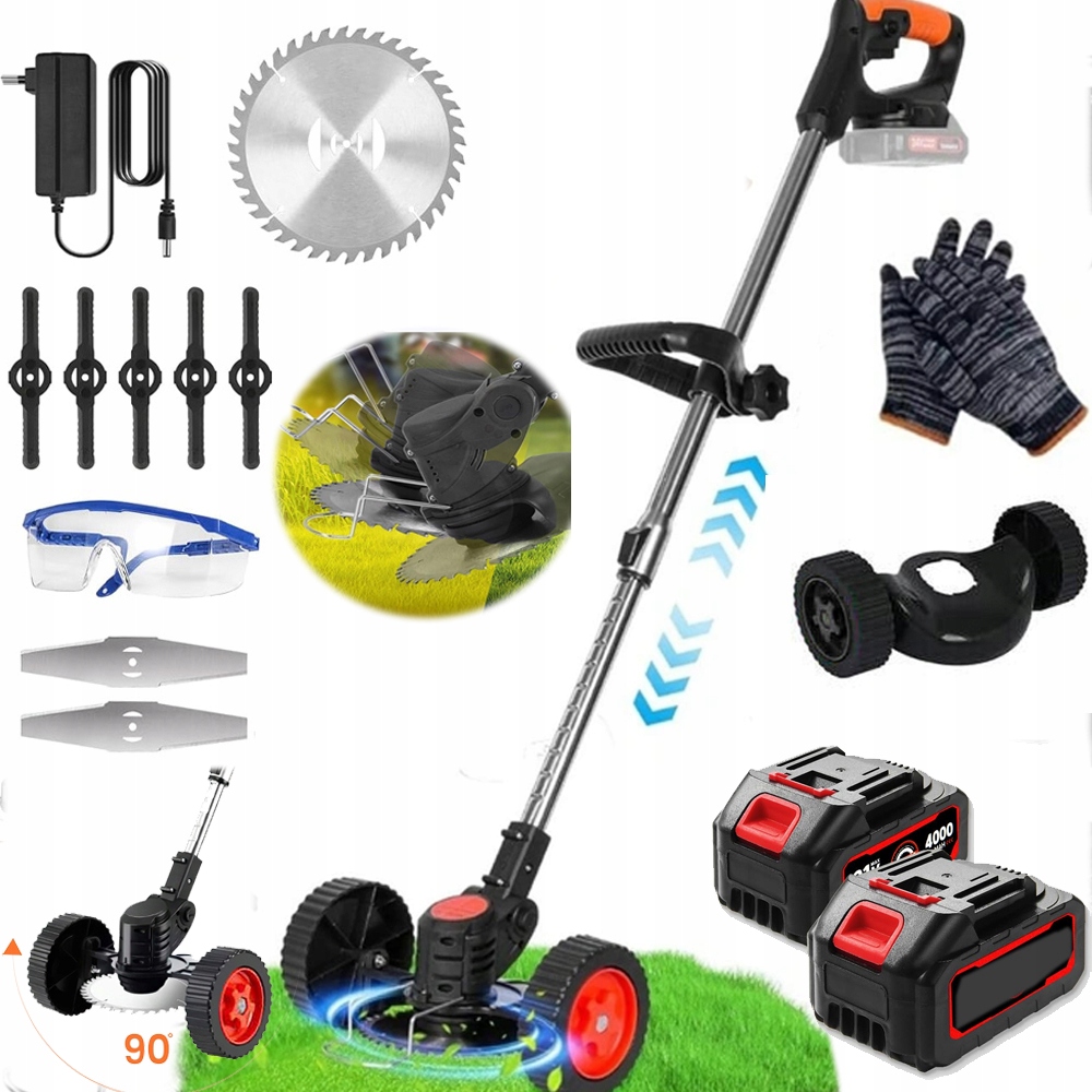 бездротовий садовий коник з 5 пластиковими лопатями для обрізки молодої трави; 2 леза з нержавіючої сталі для швидкого різання газонів, бур’янів та невеликих чагарників; 1 ріжучий диск, виготовлений з марганцевої сталі з високою різницею. Міцний, підходить для обрізки товстіші гілки чагарників. Переконайтесь, що косарка зберігається вчасно.
