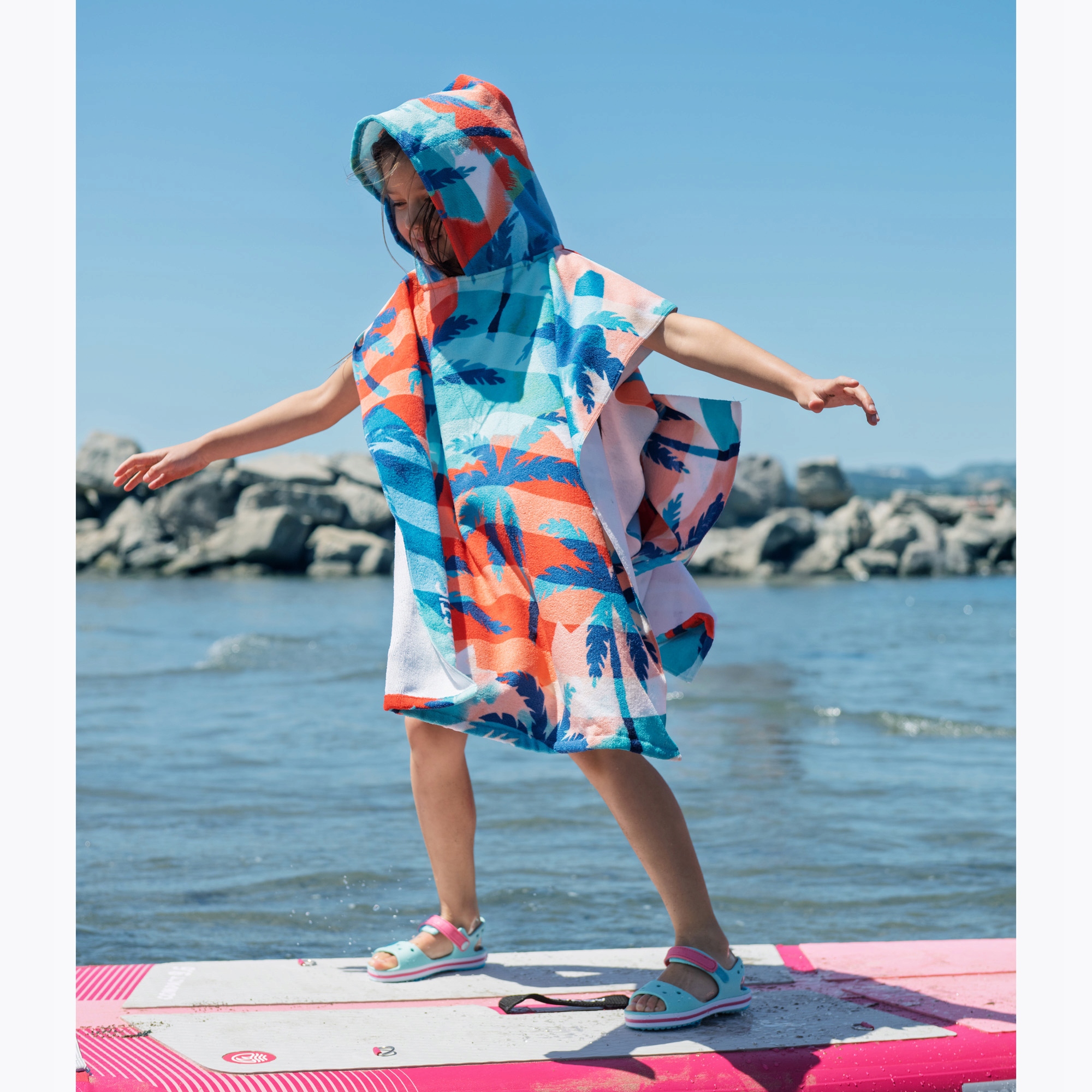 піна EVA (етилен та ацетат Wvivyle), відома своєю гнучкістю, низькою ваги та водостійкістю, використовувались для виготовлення верхньої та підошви. Цей матеріал добре адаптується до форми стопи дитини, не викликаючи тиску чи потертостей. Єва також легко обслуговувати - просто протріть, щоб вона знову була новою. Це чудове рішення для літніх днів, повних розваг.
