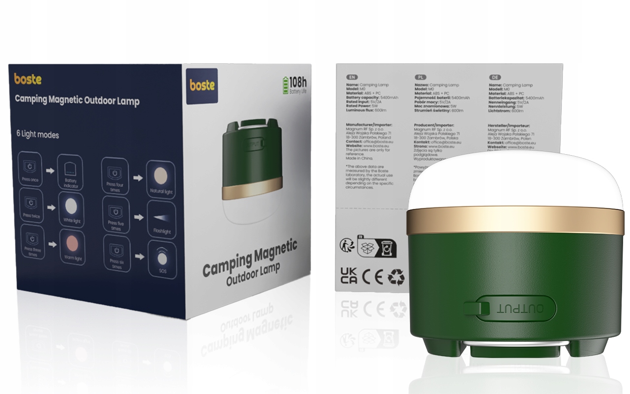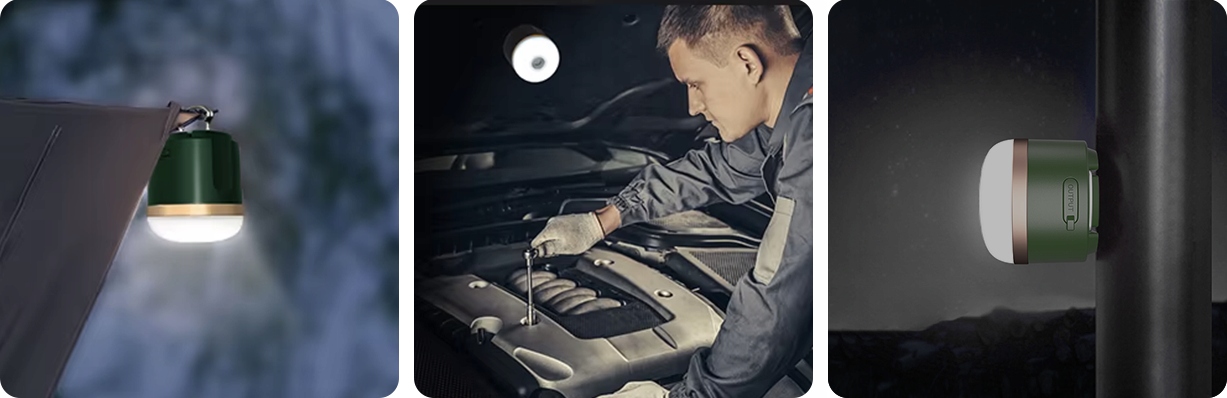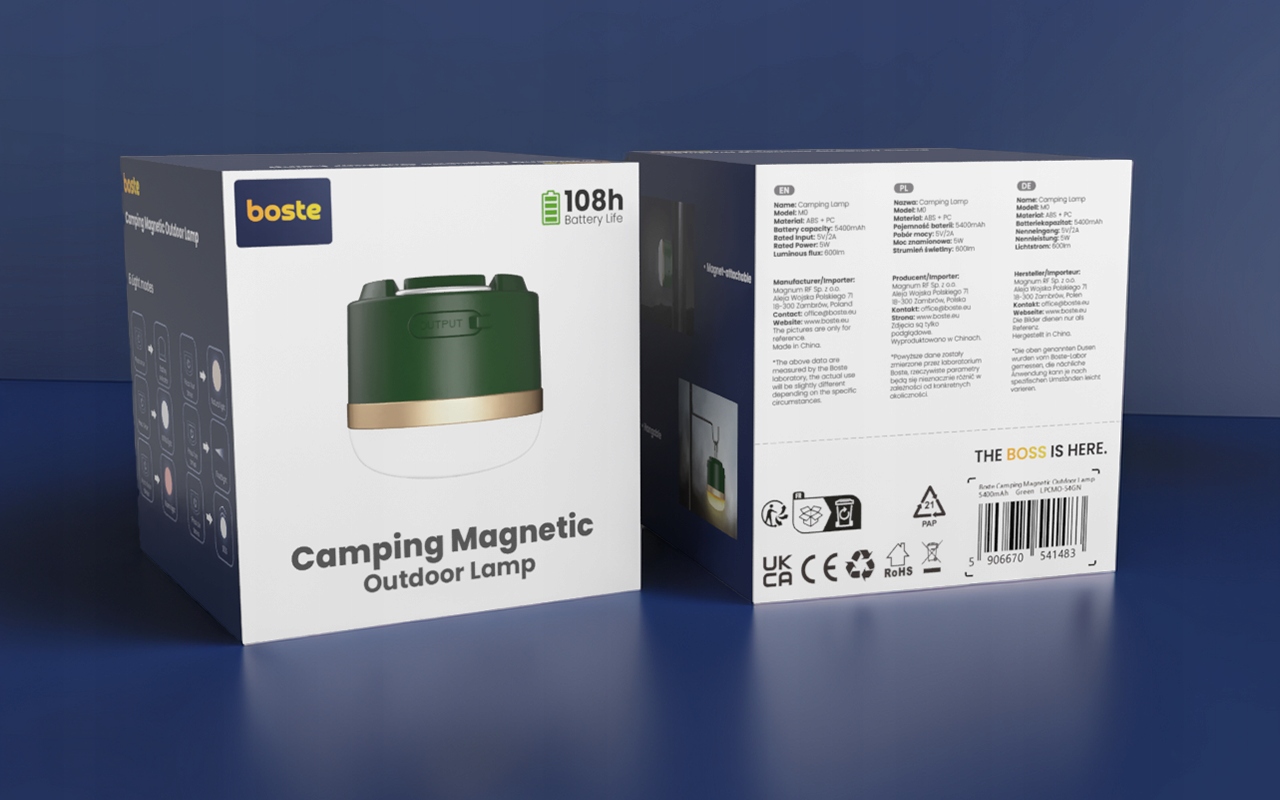 Виробник - це універсальна, магнітна туристична лампа, оснащена сильним акумулятором 5400 мАг, , яка також служить електростанцією для зарядних телефонів. Ліхтарики понад 260 метрів. Завдяки компактному розміру, сильним магнітам та класу водостійкості IP65 , він ідеально підходить для кемпінгу, риболовлі, польових робіт або прогулянок із собакою.