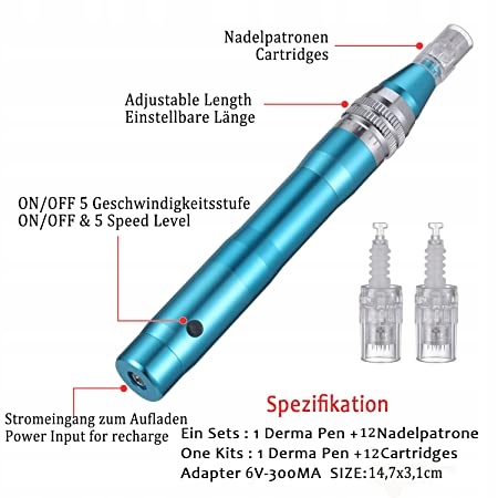 • Голка мінімально перфорує шкіру, таким чином природним чином стимулюючи вироблення колагену та еластину. Після процедури поглинаюча здатність шкіри може бути більш ніж у 40 разів вищою та значно зменшує шрами (наприклад, сліди від прищів) і розтяжки. Derma Pen з картриджами ідеально підходить для догляду за обличчям за допомогою гіалуронової сироватки, вітамінів або ретинолу.