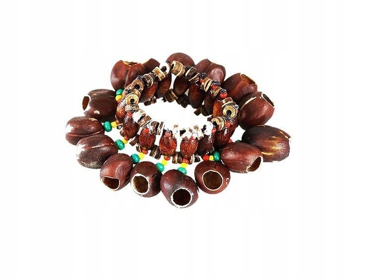 оригінальний, етнічний інструмент, виготовлений з дати, закріплених на браслеті, виготовленому з розтяжної гумки, прикрашеної намистинами. Це звучить цікаво, це виглядає чудово. Ідеальний подарунок для дитини, прикраса будинку або опора в танці чи виступі.