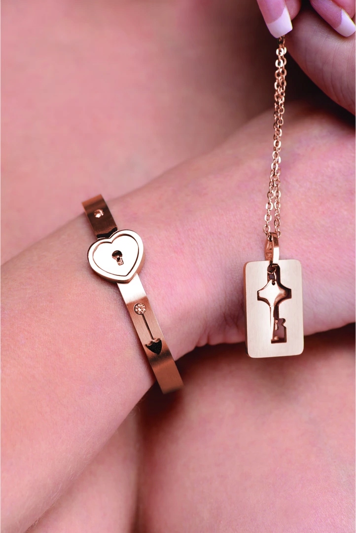 Відкрийте для себе унікальний набір XR Brands - браслет з елегантною манжетою та стильне кольє з ключем у відтінку рожевого золота. Це ідеальне поєднання сучасного дизайну та високоякісного виконання, яке чудово підійде як прикраса, так і як практичний аксесуар стилю.