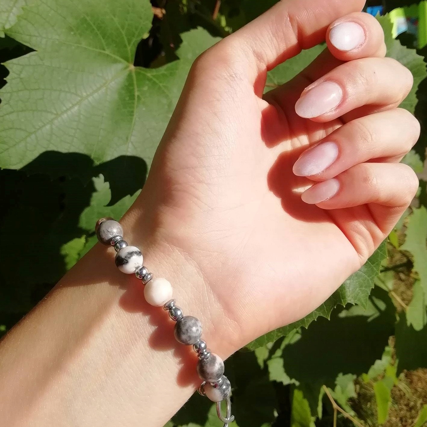 Браслет з десятидекадною чоткою ручної роботи з напівдорогоцінного каміння - родоніту (8 мм) і гематиту,