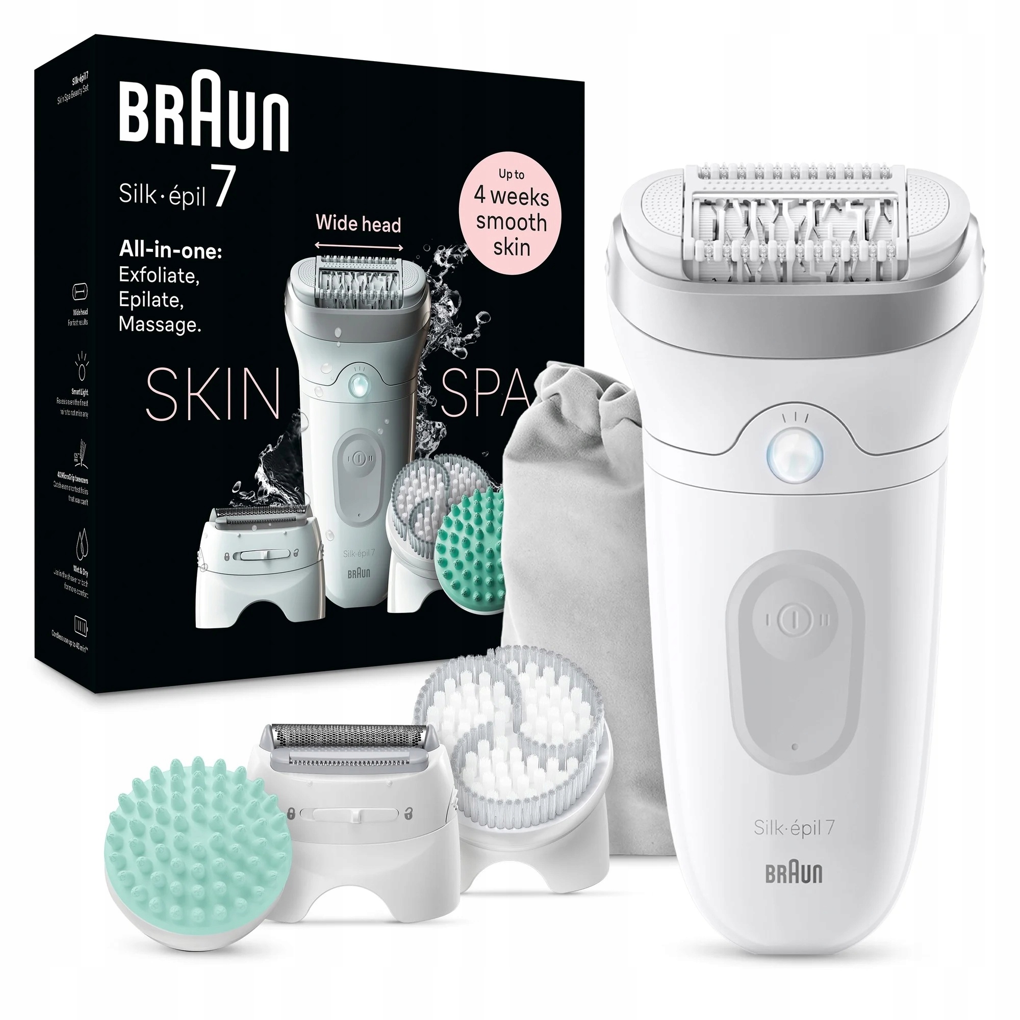 до місяця, шовковиста гладка шкіра в будь -який час, в комфорті власного будинку. Скінпа все в одному, набір для гладкої шкіри від ноги до ніг: містить масажний кріплення, відлущувальну щітку, кріплення для гоління та кріплення для різання. Продуктивність: Широке кріплення видаляє більше волосся одночасно (порівняно з епілятором шовку Braun épil 5). Епілятор фіксує навіть найкоротше волосся (0,5 мм), з яким вос не може впоратися. Зручне видалення волосся завдяки масивному прикріпленню, що допомагає зменшити відчуття болю. Акуратно видалення волосся: вологе та сухе використання. Делікатна депіляція у ванні або душі зменшує відчуття болю, забезпечуючи комфорт депіляції. Промениста, шовковиста гладка шкіра на власних умовах: без необхідності домовитись про зустріч, проста рутинна допомога, шовковиста гладка шкіра протягом багатьох тижнів. Технічні властивості