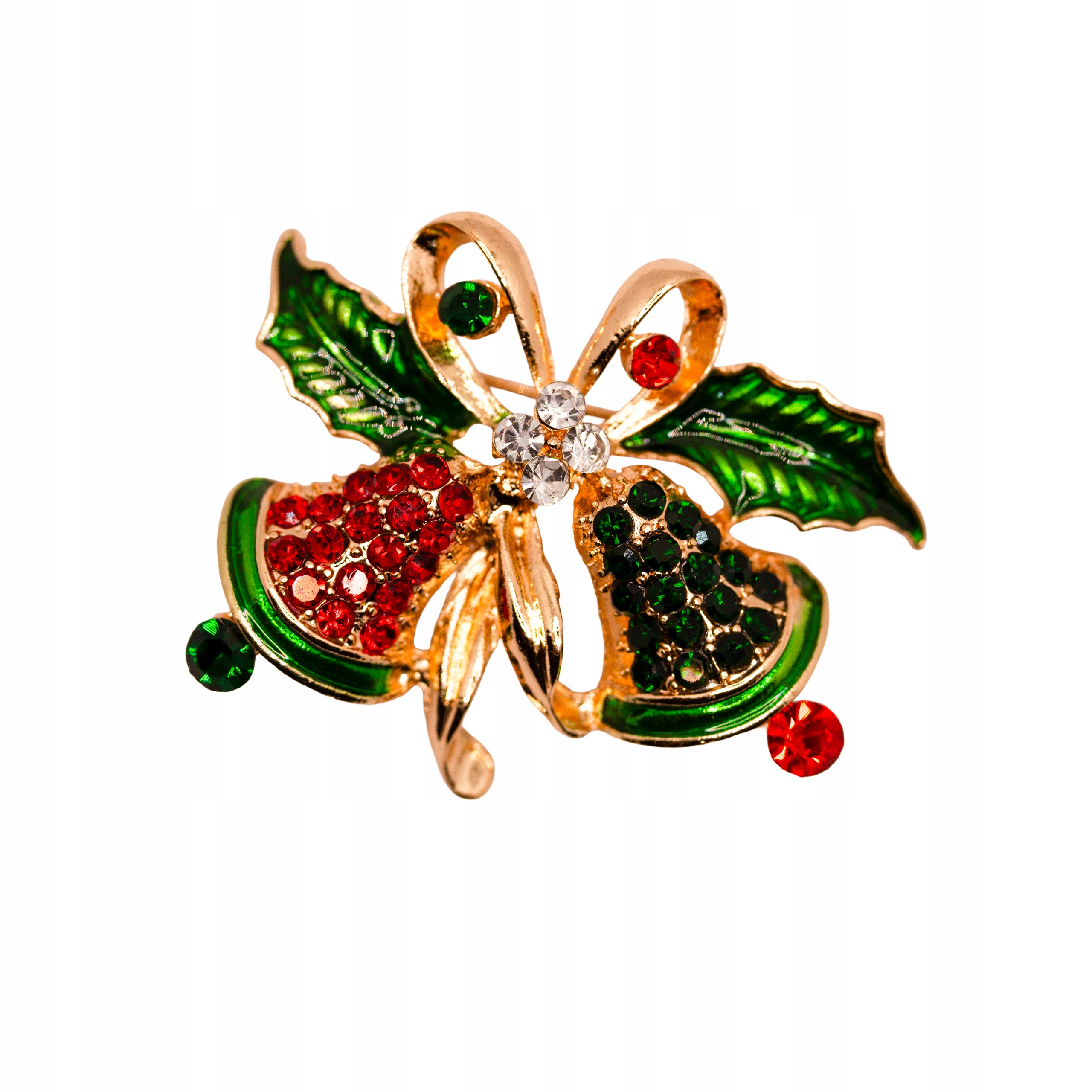 Стильна різдвяна брошка у формі золотих дзвіночків, прикрашена блискучими цирконами червоного та зеленого кольорів.