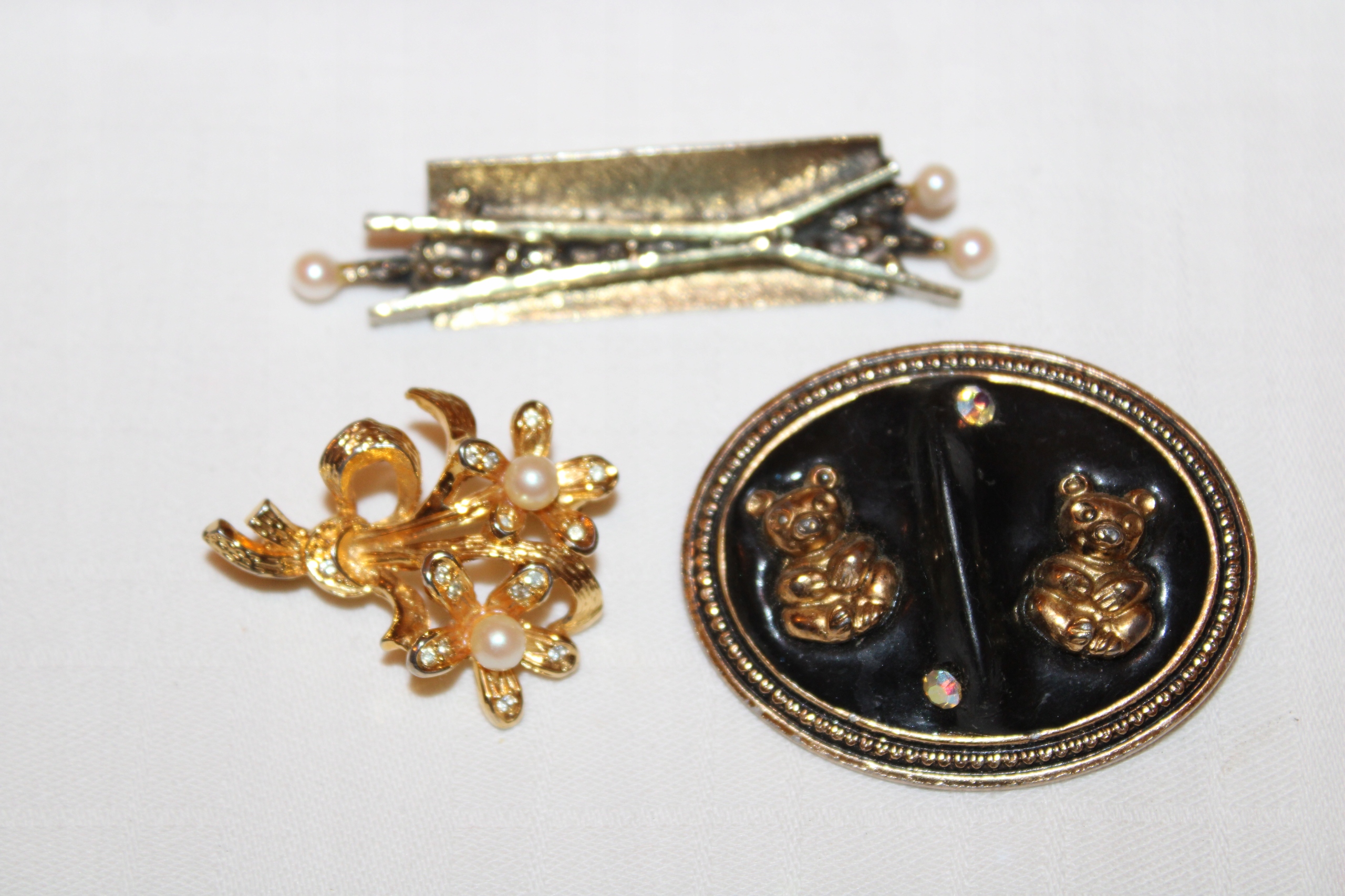 Три брошки, квіти, позолочений метал з перлами, метал з чорним матеріалом і плюшевими ведмедиками, срібло з 3 перлами, срібло 925 проби, розмір 6,5 см х 1,5 см. У вартість входить комплект.