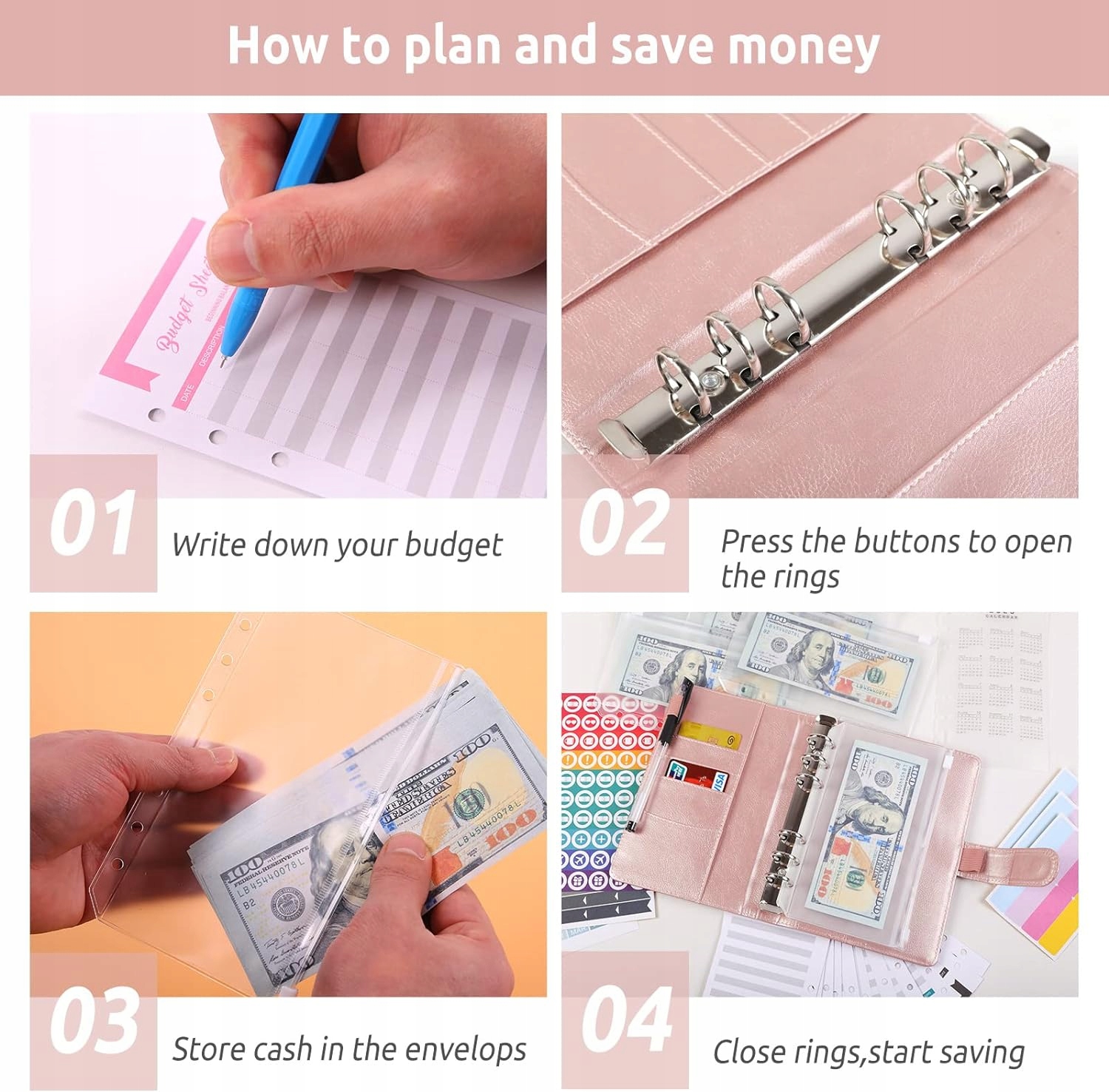 Бюджетний планувальник конвертів Budder A6 з 8 конвертами за готівку, 12 бюджетних аркушів, палітурка з грошима з етикетками, що заощаджують гроші, щоб заощадити гроші 1>